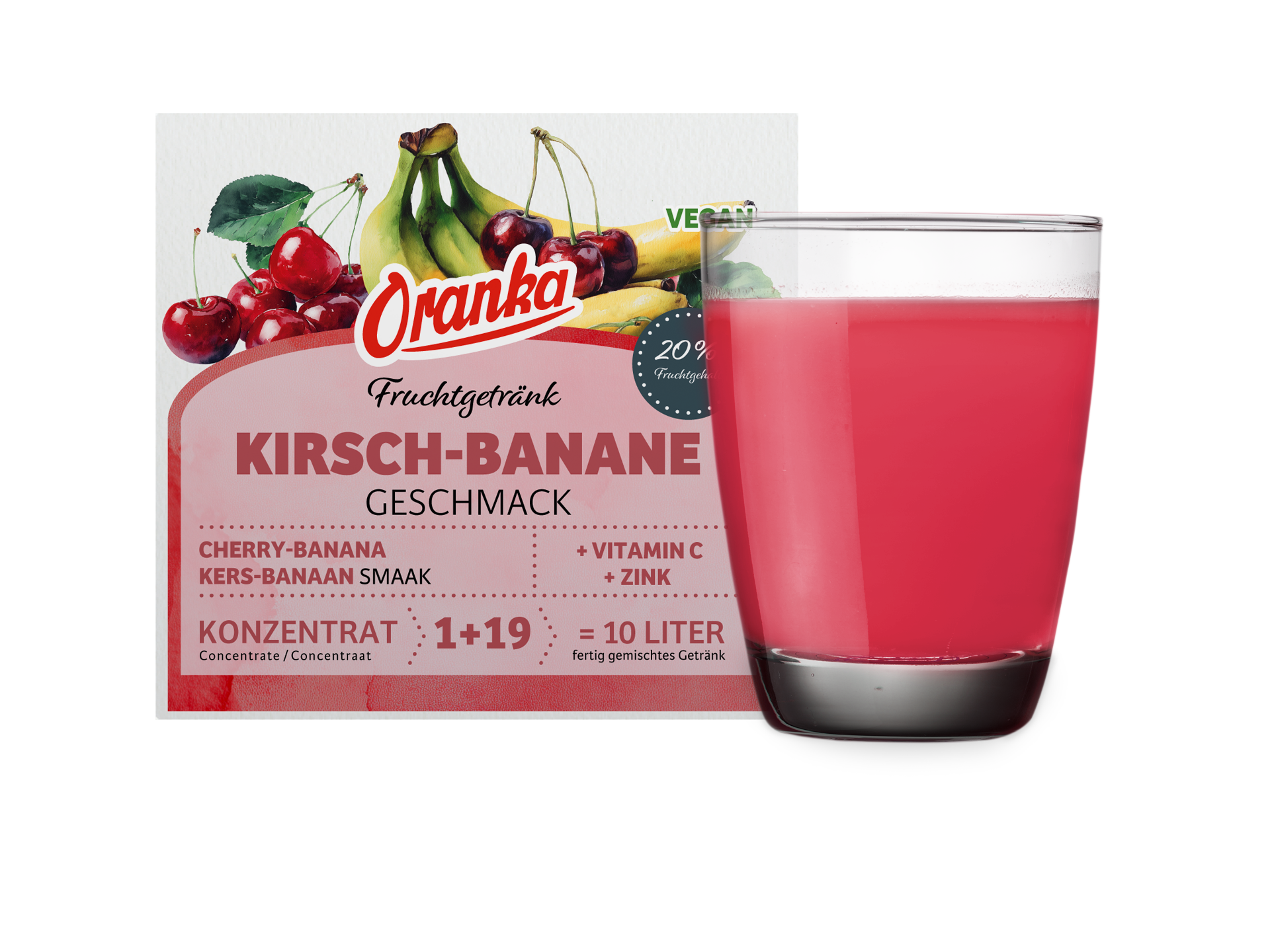 Fruchtsaftkonzentrat (Apfel, Sauerkirsche), Quellwasser, Bananenpüree, Säuerungsmittel Citronensäure, Süßungsmittel (Natriumcyclamat, Acesulfam K, Natriumsaccharin), Vitamin C, Zinklactat, Aroma.
